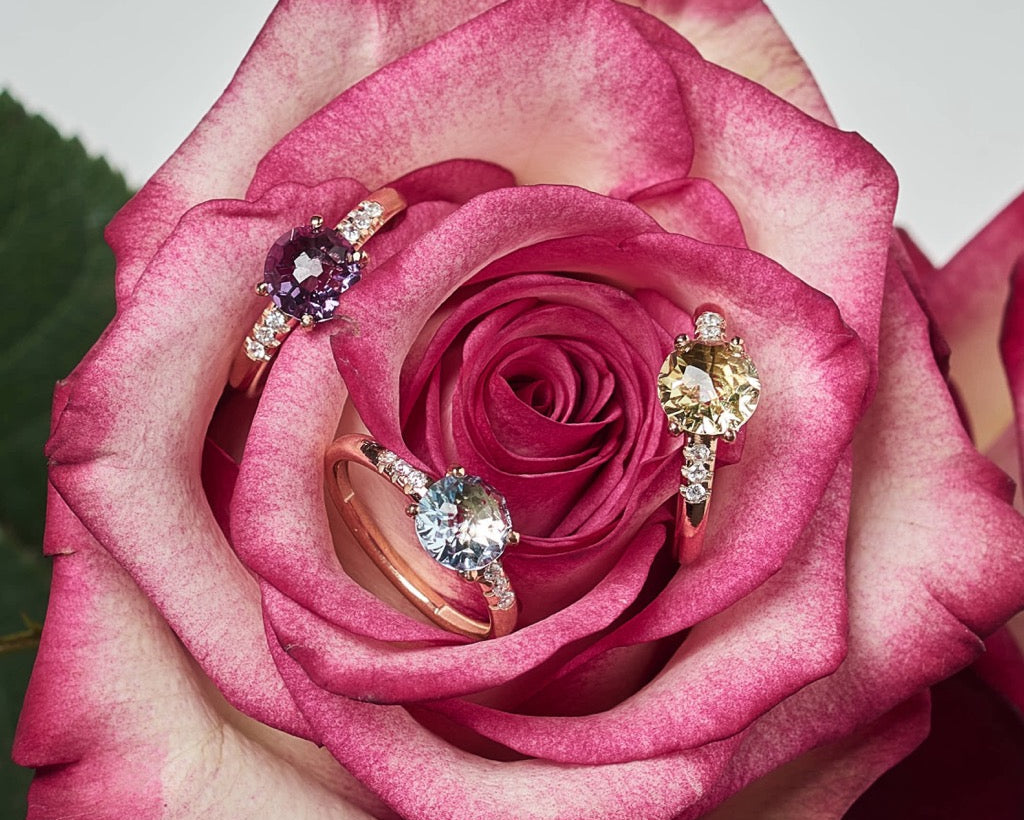 Gioielli in oro rosa 18 carati con pietre colorate e diamanti, pensati per essere indossati ogni giorno con naturalezza.