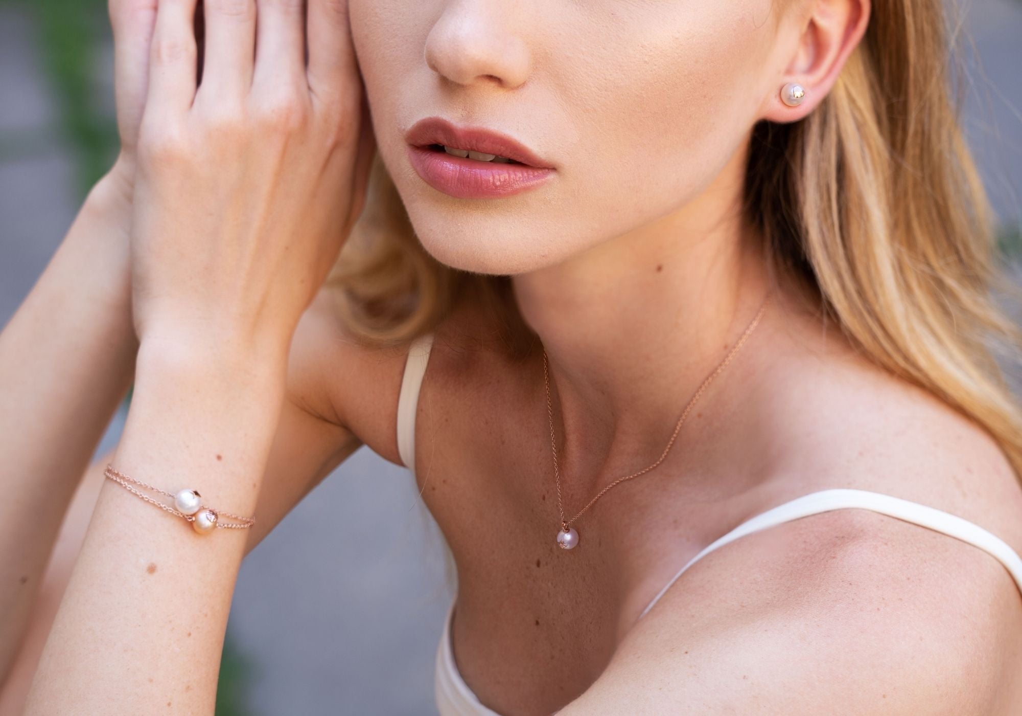 Perle d’acqua dolce dai riflessi cangianti, impreziosite da simboli portafortuna in oro rosa 9k.